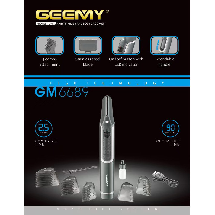 ماشین اصلاح جیمی مدل 6689 مناسب برای اصلاح مو صورت ، مو بدن و همچنین برای افرادی که میخواهند صفر اصلاح کنند . باطری این دستگاه لیتیوم یون ( سریع شارژ ) میباشد و با 150 دقیقه شارژ ، 90 دقیقه کارکرد دارد. یکی دیگر از ویژگی های این دستگاه برق و شارژ بودن آن میباشد . بدنه دستگاه این قابلیت را دارد که به سمت بالا حرکت کند تا اصلاح بهتری داشته باشد . تیغه این دستگاه کامل باز میشود تا بهتر قابل شست و شو باشد و همچنین اسن دستگاه دارای 5 عدد شانه به سایز های 3-5-7-9 و 12 میلی متر میباشد .