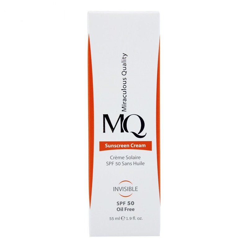 کرم ضد آفتاب بدون رنگ ام کیو، SPF50، مدل INVISIBLE، مناسب پوست چرب و مستعد آکنه حجم 55 میلیلیتر، فاقد چربی، محافظت کننده در برابر اشعه UVA ،UVB، تنظیم کننده ترشح چربی، ضد آب، ضد چروک، مرطوبکننده، دارای فرمولاسیون فیزیکی و شیمیایی، با ماندگاری 2 ساعته