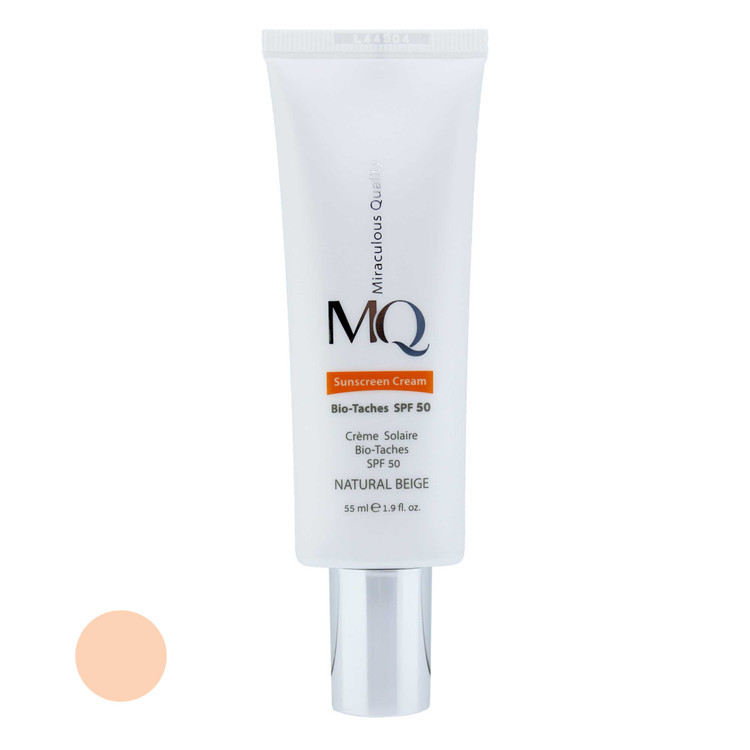 کرم ضد آفتاب رنگی ام کیو، SPF50، مدل NATURAL BEIGE BIO TACHES، مناسب انواع پوست تنالیته رنگ متوسط و حجم 55 میلیلیتر، ضد آب، محافظت کننده در برابر اشعه UVAو UVB، ضد لک، مرطوب کننده، با ماندگاری 2 ساعته