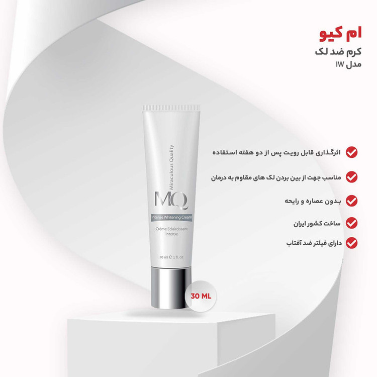 محصولات MQ ساخته شده از مواد با کیفیت می باشد. این محصولات در یکی از معتبرترین لابراتوارهای فرانسه و زیر نظر اساتید فن در صنعت مراقبت از پوست و مو فرموله شده است. این کمپانی کرم روشن کننده و ضد لک Intense Whitening Cream روانه بازار کرده است. که به واسطه تركيب موثر هیدروکینون همواره درمان قوی و سريع انواع لک محسوب می شود و در صورت استفاده صحیح از محصول، پس از دو هفته اثرگذاری قابل رويتی از خود نشان می دهد. از آنجایکه این کرم بسیار مناسب جهت از بین بردن لک های مقاوم به درمان است لذا درمانی موثر برای لک های ناشی از آفتاب، جای جوش، لیزر، پیلینگ، افزایش سن و بارداری است. از طرفی به دلیل داشتن فیلتر ضد آفتاب از پوست شما در برابر اشعه های مضر آفتاب محافظت می کند.