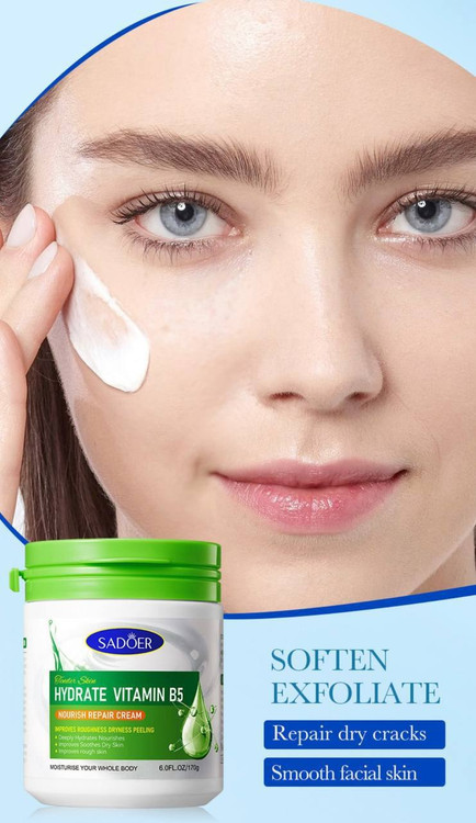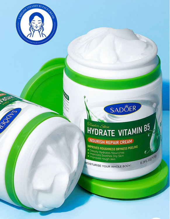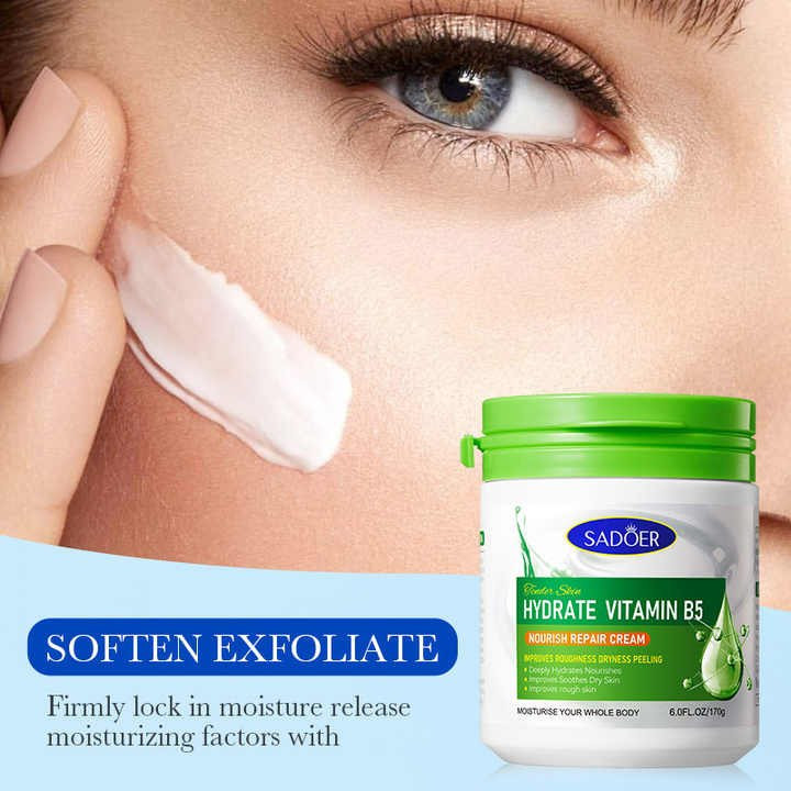 کرم ویتامین B5 با لایه برداری سلول های مرده، خشکی و زبری پوست را بهبود می بخشد و با آبرسانی و تغذیه عمیق، به پوست کمک میکند تا انواع آسیبهای پوستی و جای جوش و لک و غیره بهبود یابد ،همچنین بهعنوان یک آبرسان و رطوبت رسان و هیدراته کننده پوست میباشد و بعنوان عامل ضدپیری و جوانساز برای پوست کاربرد دارد.