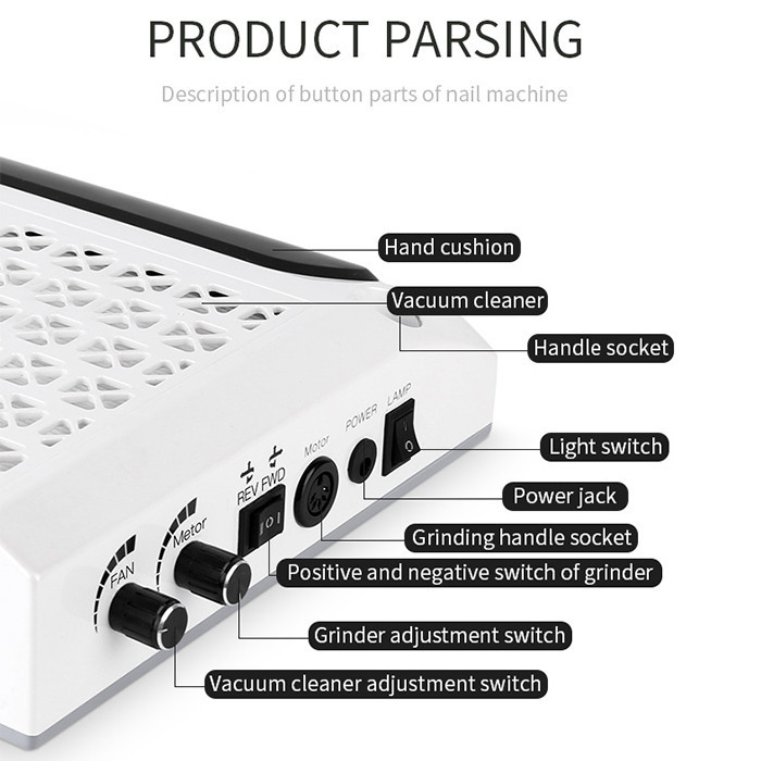 پکینگ دستگاه شامل : 1-بدنه اصلی 2-چراغ روشنایی 3-هندپیس 4-فن و سینی زیر دست 5-آداپتور 6- 6عدد سری سوهان 7-کتابچه راهنما