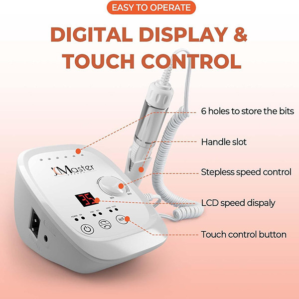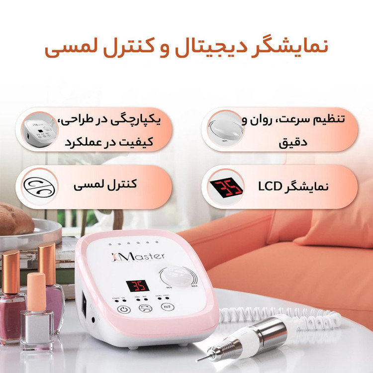 JCMASTER یک دستگاه سوهان ناخن حرفهای با سرعت 35000 دور در دقیقه، پدال کنترل و 6 سری مختلف است. این محصول برای استفاده در سالنهای ناخن و همچنین استفاده شخصی در منزل طراحی شده است. قدرت و سرعت قابل تنظیم: این سوهان ناخن با سرعت قابل تنظیم از 0 تا 35000 دور در دقیقه، حتی سختترین ژلهای ناخن را به راحتی حذف میکند. موتور بدون برس: موتوری که در دستگیره قرار دارد، باعث میشود دستگیره در هنگام کار، بیصدا و بدون لرزش باقی بماند. کنترل آسان: سرعت سوهان ناخن را میتوان با پدال کنترل کرد. نمایشگر LED سرعت فعلی را نشان میدهد و طراحی لمسی آن، استفاده را آسان میکند و مانع ورود گرد و غبار ناخن به داخل دستگاه میشود. طراحی ارگونومیک: دستگیره این دستگاه، طراحی جمعوجور و فوقالعاده سبکی دارد که باعث راحتی در دست گرفتن آن میشود. سیستم محافظت در برابر گرمای بیش از حد، اطمینان میدهد که دستگیره حتی پس از استفاده طولانی مدت، گرم نخواهد شد. استاندارد جهانی: دستگیره این دستگاه با تمام سریهای تجاری ناخن (با قطر 2.35 میلیمتر) سازگار است. 6 سری مختلف در بستهبندی آن وجود دارد که هر کدام عملکردهای متنوعی در مانیکور و پدیکور دارند و تعویض آنها آسان است. جهت چرخش دستگیره نیز قابل تنظیم است و برای افراد راستدست و چپدست مناسب است. کاربردهای متعدد: این دستگاه برای مراقبت از ناخنها، از جمله حذف ژلهای نیمهدائم، ژل ناخن، ناخنهای آکریلیک، ناخنهای مصنوعی، کوتاه کردن ناخنهای طبیعی، نازک کردن ناخنهای ضخیم و کوتاه کردن ناخن حیوانات خانگی مناسب است. همچنین برای مجسمهسازی، حکاکی، سوهانکشی، سمبادهزنی، پولیش و سوراخکاری نیز کاربرد دارد.