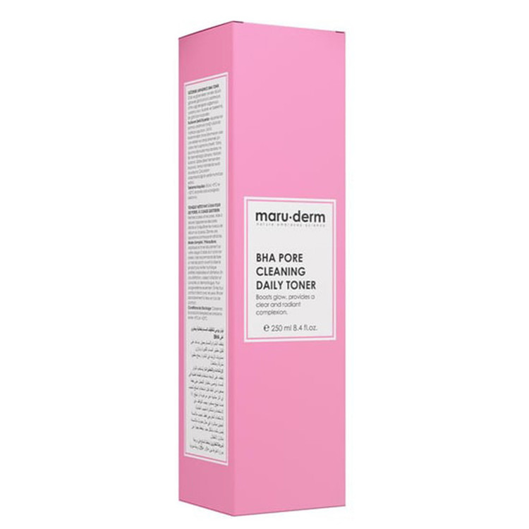 تونر روزانه پاک کننده منافذ پوست مارودرم حاوی بتا هیدروکسی اسید BHA برای نفوذ به عمق منافذ پوستی و پاکسازی انها است. این تونر منافذ پوست را کوچک کرده و جوش های سر سیاه را از بین میبرد. مناسب پوست های دارای آکنه و جوش های سر سیاه و دارای منافذ باز است . صبح و عصر با پد بهداشتی استفاده شود.