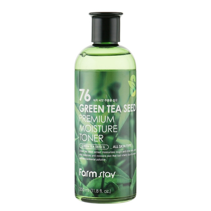 FarmStay 76 Green Tea Seed Premium Moisture Toner یک تونر مرطوب کننده با عصاره دانه چای سبز است که به آبرسانی و نرم کردن پوست خشک کمک میکند. این محصول همچنین به تعادل و بازیابی پوستی که به دلیل استرس و آلودگی محیطی دچار از دست دادن حیات شده، کمک میکند. سدیم هیالورونات و گلیسیرین موجود در این تونر دو ماده مرطوب کننده هستند که به حفظ رطوبت پوست کمک میکنند. عصاره دانه چای سبز (Camellia Sinensis Seed Extract) یک مرطوب کننده و دارای خواص ضد التهابی بالاست. عصاره رزماری (Rosmarinus Officinalis Extract) دارای خواص ضد میکروبی و مرطوب کننده است. این تونر با استفاده منظم، میتواند به بهبود بافت پوست، کاهش چین و چروکهای ریز و کاهش عمق چروکهای برجسته کمک کند و همچنین به مقابله با بروز جوشهای پوستی و جلوگیری از ایجاد جوشهای جدید کمک میکند.