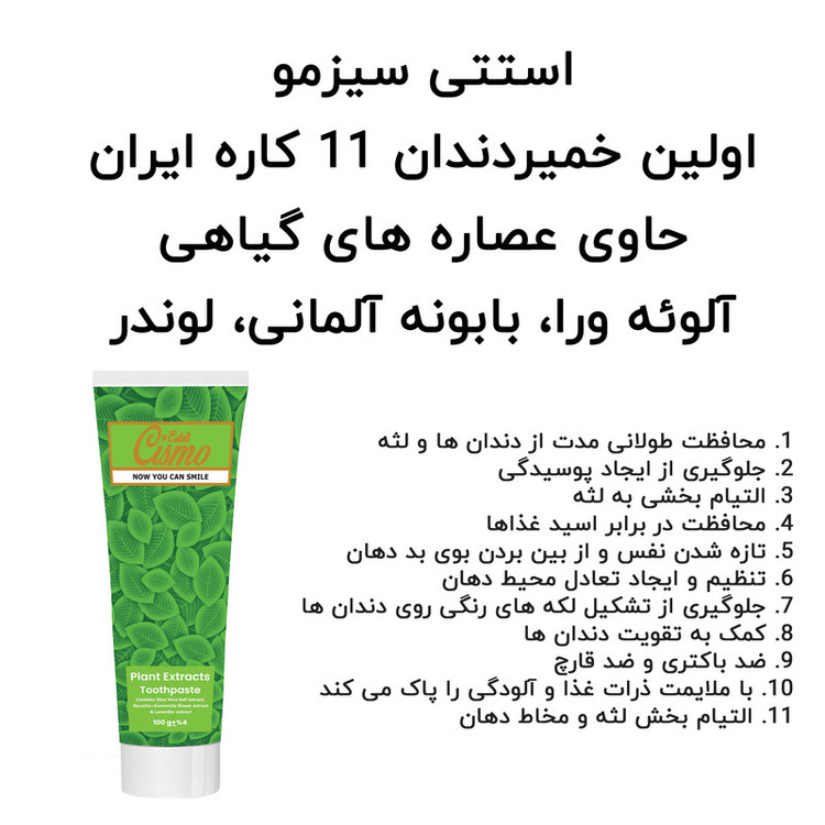 خميردندان گیاهی استتی سیزمو حاوي عصاره هاي خالص گياهي آلوئه ورا ، لوندر و بابونه آلماني می باشد. ترکيبات آنتراکينون که در آلوئه ورا وجود دارند ضد باکتري بوده و با کنترل باکتري ها مانع ايجاد پوسيدگي مي شوند. همچنين اين ماده خاصيت ضد التهابي دارد. عصاره لوندر نيز ضد باکتري ، ضد التهاب ، ضد درد و آنتي اکسيدان است. بابونه آلماني باعث کاهش چشمگير تشکيل پلاک دندان و کاهش التهاب لثه مي شود. استفاده از اين خميردندان سلامت و آرامش لثه و دندان ها را به ارمغان مي آورد.