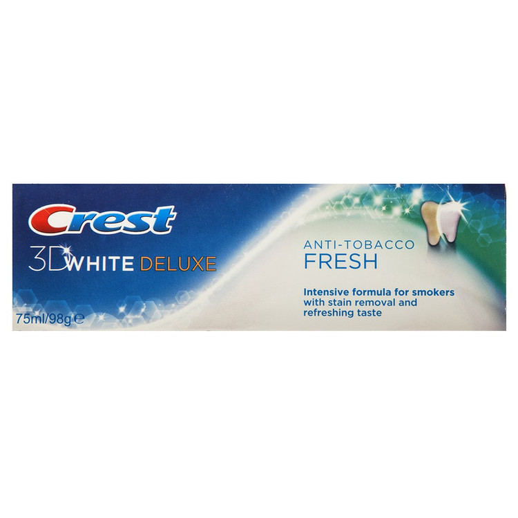 یکی دیگر از محصولات بسیار خوب برند «کرست» (Crest)، خمیردندان مدل «Anti-Tobacco Fresh» از سری «3D White» است. این خمیردندان کمک میکند لکههایی که در اثر مصرف مداوم موادی مانند قهوه، چای، سیگار و... روی دندانها ایجاد شدهاند، از سطح دندان حذف شوند. روند تاثیرگذاری ترکیبات این محصول تنها پنج روز زمان میبرد تا دندانها را به صورت قابلملاحظهای سفید کند. ویژگی خاص این خمیردندان از طریق وجود سیلیس هیدراته و اقدام سایشی ملایم آن نمایان میشود. ترکیب موجود باعث میشود که لکههای روی دندان، بهخصوص در افراد سیگاری از بین بروند. این سفیدکنندگی و حذف لکهها در کنار محافظت از مینا و استحکام دندانها صورت میگیرد. این خمیردندان در واقع از یک فرمول سهمرحلهای سفیدسازی استفاده میکند که شامل تمیزکردن شیمیایی، تمیزکردن مکانیکی و کمک به جلوگیری از بهوجودآمدن لکههای جدید است. ترکیبات سالم این محصول علاوهبر خاصیت سفیدکنندگی و محافظت از مینای دندان، باعث ایجاد نفس تازه و ازبینرفتن بوی بد دهان میشود. این محصول لبخندی زیبا، باطراوت و سالم را به ارمغان میآورد.
