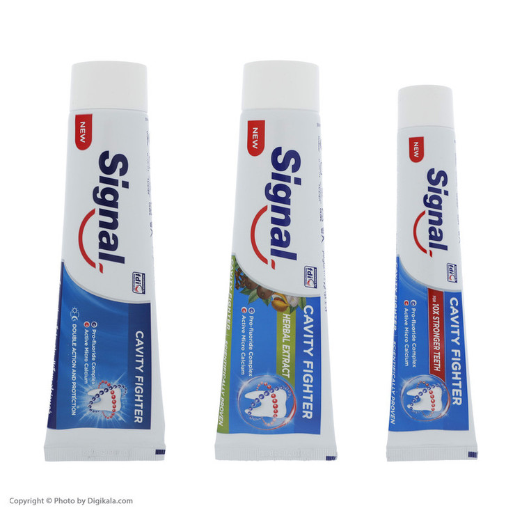 خمیر دندان ضد پوسیدگی با حجم 50 و حجم 100 میلیلیتر به علاوه خمیر دندان ضد پوسیدگی با طعم گیاهی و حجم 100 میلیلیتر