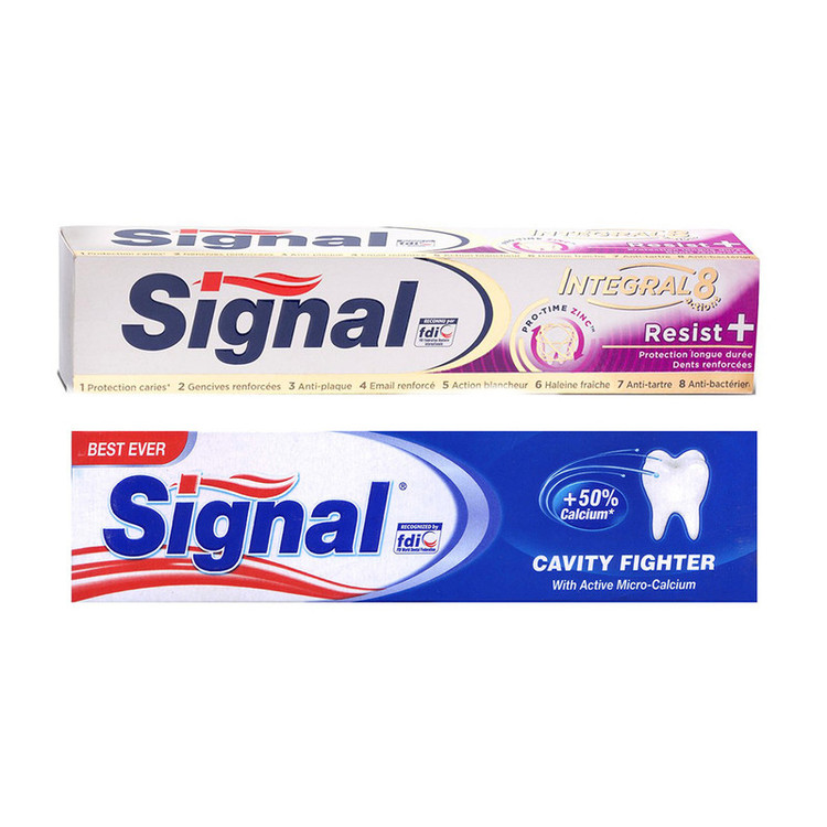 خمیر دندان سیگنال مدل Resist به همراه خمیر دندان سیگنال مدل Cavity Fighte در یک بسته دو عددی کاملا به صرفه ارائه شده که بسیار مورد نیاز و مقرون به صرفه است. کیفیت خمیردندانهای سیگنال مورد تایید بسیاری از متخصصین قرار گرفته و انتخاب بسار مناسبی است.از خمیر دندان برای تمیزشدن و محافظت از مینای دندان استفاده میشود. خمیردندان حاوی فلوراید، یک خاصیت دارد و آن هم تمیزکردن و جرم زدایی از دندانها و خوشبوکردن محدوده دهانی شماست. بهتر است که هر فرد خمیر داندان را بر اساس شرایط دندانهای خود انتخاب کند زیرا قطعا دندانهای سالمتر مانند دندانهای جرمدار و پوسیده نیاز به خمیر دندان قوی ندارند. و در غیر این صورت ممکن است به دندانهایشان آسیب برسانند؛ بر عکس این امر نیز صادق است دندانهای جرمدار و افرادی که سیگار و یا کافئین زیاد مصرف میکنند خمیر دندانی قویتر نیاز دارند. در انتها باید توجه کنید که مناسبترین فرد برای مشاوره در انتخاب بهترین خمیردندان پزشک شما است. این پک خمیر دندان دارای عصارهی خوشبوی نعنا بوده که باعث خنکی دهان و دندانها میشود. این خمیر دندان خاصیت ضد پوسیدگی داشته و از ایجاد جرم ، پلاک و التهاب لثه جلوگیری میکند.