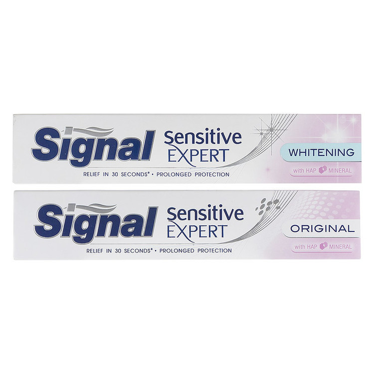 با انتخاب محصولات برند «سیگنال» (Signal)، مراقبت از دندانها کار چندان پیچیدهای نخواهد بود. پک دو عددی خمیر دندان سیگنال شامل یک خمیردندان مدل «Original» در حجم 100 میلیلیتر و یک خمیردندان سفیدکننده مدل «Whitening» در حجم 100 میلیلیتر است. هر دو محصول از مواد معدنی مفیدی برای دندانها تشکیل شده است. این ترکیبات از حساسیت دندان جلوگیری کرده و حس خوبی را القا میکنند. خمیردندان سفید کننده سیگنال، ترکیبات موثری برای حذف رنگدانههای ایجادشده روی دندان دارد و قادر است که رنگ دندانها را به میزان چشمگیری روشن سازد. هر دو محصول حاوی موادی هستند که از مینای دندان محافظت کرده و استحکام دندانها را حفظ میکنند. استفاده از این پک به خانواده کمک میکند که دندانهایی سالم، بدون حساسیت و روشن داشته باشند. ترکیبات موثر این دو کمک میکنند که محیط دهان تازه شده و از ایجاد بوی بد جلوگیری شود. این پک انتخابی بهصرفه و مرغوب است.