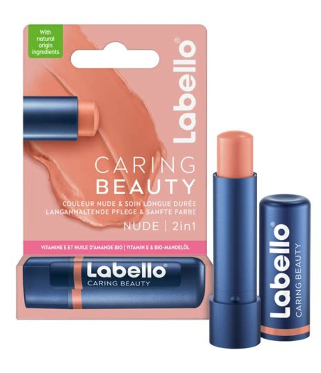 "بالم لب لابلو مدل Labello Caring Beauty 2IN1 رنگ نود، مرطوبکننده و مغذی با ویتامین E و روغن بادام ارگانیک، همراه با رنگی طبیعی و ملایم