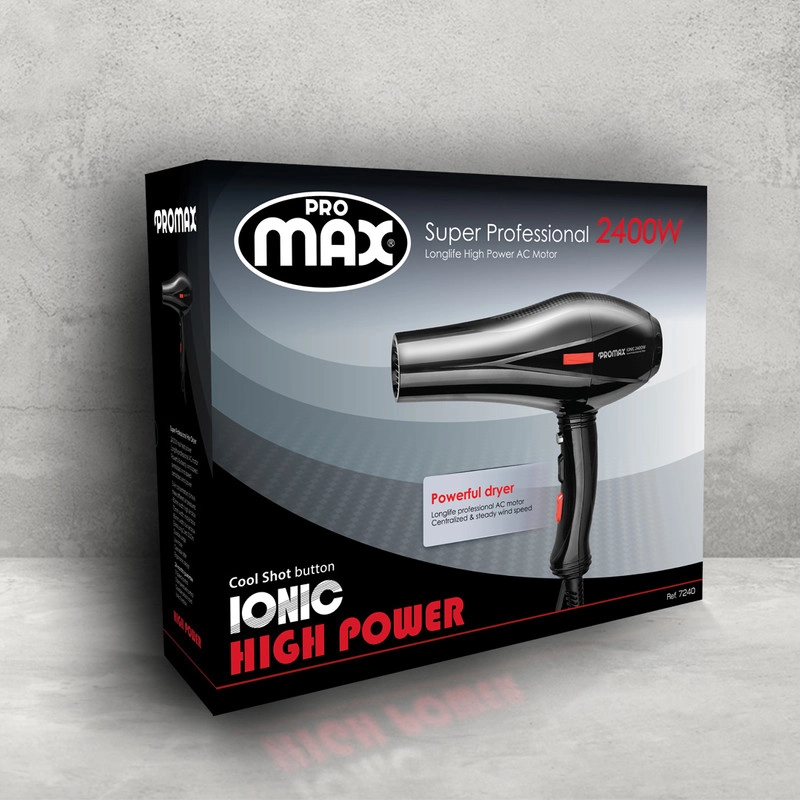 توان موتور سشوارهای خانگی عموماً زیر 2000وات و توان موتور سشوارهای حرفهای بالای 2000وات است. شرکت پرومکس اقدام به تولید سشوار حرفهای با موتور AC و توان 2400وات کرده است. سشوار حرفه ای Promax مدل 7240 علاوه بر قدرت موتور بالا دارای فناوری تولید یون، دکمهی باد سرد و سه متمرکز کنندهی هوا است که نیازهای شخص را برای استفادهی حرفهای برآورده میکنند. برای خشککردن و حالت دادن به موها که به آن براشینگ میگویند احتیاج به سرعت و حرارت مناسب است. هرچقدر قدرت موتور سشوار بیشتر باشد در مدتزمان کمتری میتوان براشینگ را انجام داد. توان 2400واتی موتور سشوار 7240 از این جهت کاملاً مناسب است. سه متمرکز کنندهی هوایی که همراه سشوار عرضه شده را میتوان با توجه به نیاز استفاده کرد. عرض این متمرکز کنندهها 60، 75 و 85 میلیمتر است. سیم مدلهای حرفهای را عموماً بلند میگیرند تا در هنگام استفاده مشکلی بابت کوتاه بودن سیم وجود نداشته باشد. سیم این مدل هم 3متر طول دارد و در محل اتصال به بدنه دارای حلقهای است که به کمک آن میتوان دستگاه را آویزان کرد. اکثر سشوارها یک حالت باد سرد دارند که در حالت فعال بودن آن المنت سشوار از کار میافتد و میتوان حالت یک قسمت از مو را تثبیت کرد. در این میان تعدادی از این سشوارها هستند که برای باد سرد یک دکمهی فنری در نظر میگیرند تا بتوان به شکل لحظهای با فشردن دکمه از باد سرد استفاده کرد و با رها کردن آن مجدداً باد گرم شود. سشوار 7240 پرومکس نیز دارای این دکمه در بالای دسته است. از ویژگیهای بارز این سشوار فناوری تولید یون است. ژنراتور یونی با روشن کردن سشوار فعال شده و یونهای منفی تولید میکند. این یونها با باد سشوار خارج میشوند و پس از برخورد به موها الکتریسیته ساکن روی آنها را از بین میبرند. بهاینترتیب وز شدن مو کمتر اتفاق میافتد و حالت دادن به موها هم راحتتر میشود. برای حالت دادن و خشککردن موها میتوان سرعت و حرارت باد را روی مقدار دلخواه تنظیم کرد. برای این کار باید از دکمههای روی دسته استفاده کرد که دو حالت سرعت متوسط و زیاد و سه حالت حرارت ملایم و گرم و داغ را فراهم میکنند.