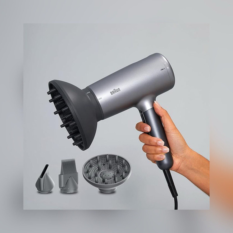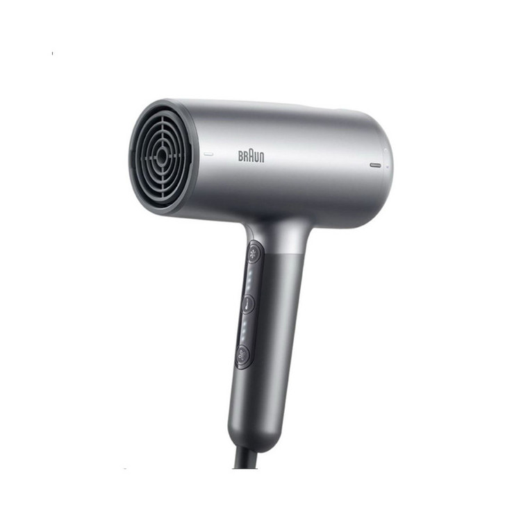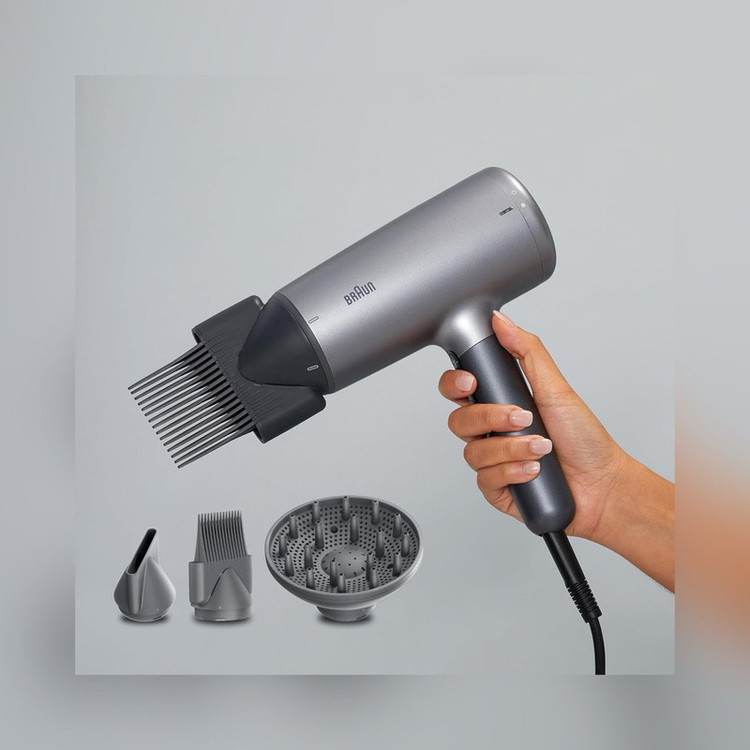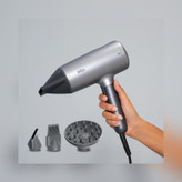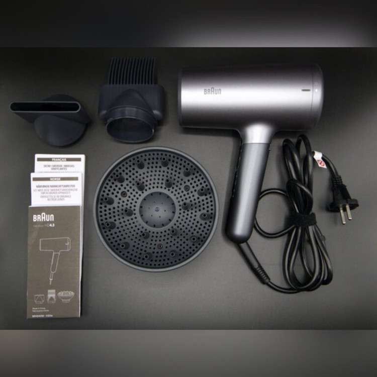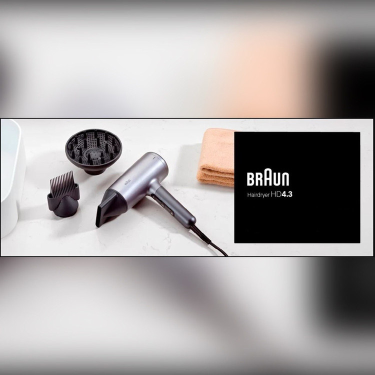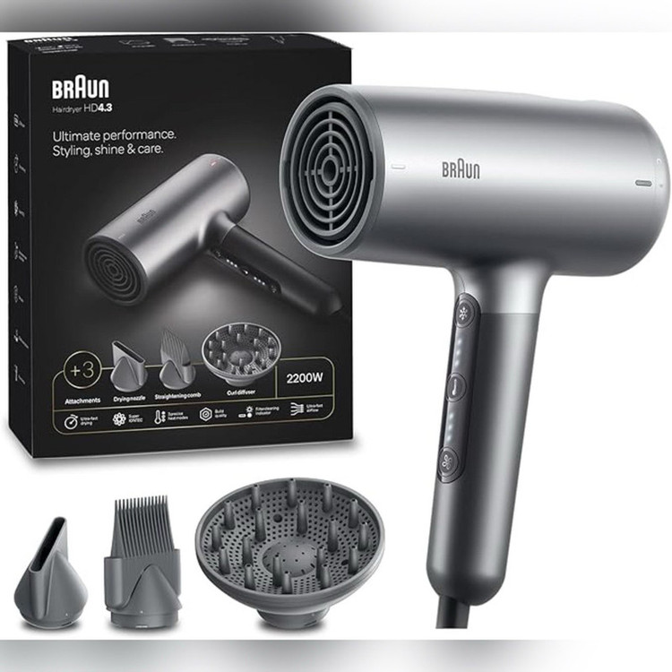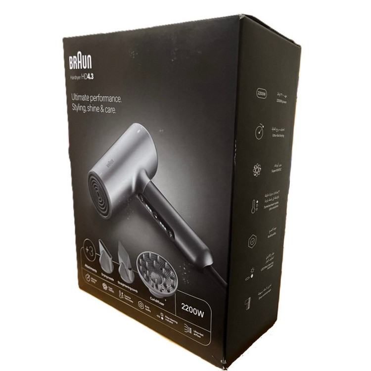 سشوار براون مدل Utimate Performance HD 4.3،از معدود محصولات این شرکت است که توسط براون آلمان طراحی شده و تحت لیسانس برند معتبر بابلیس(Babyliss) فرانسه تولید می شود. دارای موتور قدرتمند با توان 2200 واتی که با استفاده از فناوری HTDC جریان هوایی بسیار قوی برای خشک شدن مو در دمای پایین تر و سرعت بیشتر را ارائه می کند.کلیدهای مکانیکی با کلید های الکترونیکی جایگزین شدند تا علاوه بر عمر بیشتر،راحتی بسیاری را هنگام استفاده تجربه کنید.دمای باد سشوار در سه حالت و سرعت هوا نیز در سه حالت مختلف قابل تنظیم است که برای باد سرد و گرم قابل استفاده است و میزان آن توسط نشانگر led به شما نمایش داده می شود.یک کلید مجزا برای هوای سرد روی بدنه دسگاه قرار دارد.در قسمت پشت دستگاه فیلتر قرار گرفته که به آسانی باز می شود و دارای نشانگر led است و زمان تمیز کزدن آن را به شما هشدار می دهد.به لطف فناوری super iontec هیچ الکتریسیته تولید نمی گردد و باعث براق شدن و جلوگیری از مو خوره،استاتیک و وز شدن موهای شما می شود.همراه این سشوار 3 سری جانبی قرار گرفته که شامل یک drying nozzle برای متمرکز کردن جریان هوا و کاهش زمان خشک شدن و فشار گرما،یک سری شانه ای برای صاف کردن و حالت دهی مو و یک curl defuser که برای فرکردن(طبیعی) و حجم دادن به مو استفاده می شود.سیم دستگاه به طول 2 متر و 20 سانت آزادی عمل کافی را هنگام استفاده فراهم می کند و دارای یک پوشش محافظتی برای نگهداری بهتر و حمل آسان تر آن می باشد و به شما این امکان را می دهد که سیم برق را به طور ایمن دور دستگاه ببندید.از دیگر قابلیت های این سشوار می توان به pro lock(کلید محافظتی برای جلوگیری از روشن شدن ناخواسته سشوار)،کول شات(جریان هوای ساده و فوق سریع برای نهایی کردن استایل با ماندگاری بالا)،حافظه داخلی(امکان ذخیره سازی تنظیمات مورد نظر شما برای دما و سرعت باد)،ultra fast drying و ultra fast airflow اشاره کرد.همراه دستگاه یک برس مخصوص برای نظافت آسان تمام زوایای فیلتر قرار گرفته است. همچنین این محصول دارای نشان کیفیت ساخت برتر کمپانی براون می باشد.