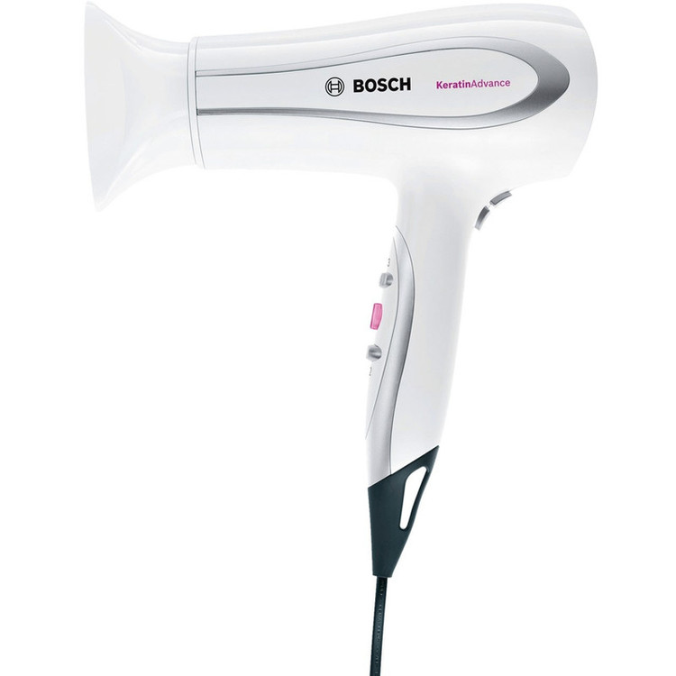 سشوار «بوش» (Bosch) مدل «PHD5987» دارای موتور 2200 وات DC، تکنولوژی محافظت از کراتین مو ، یون ساز و حالت توربو است. کراتین یک پروتئین بسیار قوی است که بخش اعظم موی انسان از آن درست شده است. کراتین باعث خاصیت الاستیسیته مو است و سلامت مو به آن بستگی دارد. استفاده ی مداوم از سشوار و اتو مو با حرارت زیاد به ریشه و کراتین ساقه ی مو آسیب می رساند و باعث می شود موها حالتی شکننده بگیرند. سشوار Bosch PHD5987 دکمه ای با علامت K دارد که با فشردن آن سشوار به شکل خودکار حرارت باد و سرعت فن را تنظیم می کند تا بر اثر حرارت زیاد به کراتین موها آسیبی نرسد. به این ترتیب رنگ موها کدر نمی شود و موها سالم و درخشان باقی می مانند. با روشن کردن سشوار یون ساز نیز فعال می شود و ذرات باردار تولید می کند. این ذرات روی ساقه ی مو می نشینند و باعث می شوند موها راحت تر شانه شوند و ظاهر نرم تر و درخشان تری داشته باشند. یون ساز سشوار را نمی توان خاموش کرد و همواره فعال است. PHD5987 دارای حالت توربو نیز است و دکمه ی آن در پشت دسته ی سشوار قرار دارد. با فشردن دکمه ی توربو سرعت فن سشوار زیاد می شود و می توان با سرعت بیشتری موها را خشک کرد. حرارت باد را روی سه حالت و سرعت فن سشوار را روی دو حالت می توان تنظیم کرد. دکمه ی باد سرد نیز کنار دکمه ی توربو قرار دارد و فنری است. با نگه داشتن این دکمه المنت حرارتی سشوار موقتا غیر فعال می شود تا بتوان به کمک باد سرد حالت بخشی از مو را تثبیت کرد. علاوه بر متمرکز کننده یک دیسپانسر نیز همراه سشوار ارائه شده است که برای حجم دادن به موها بسیار مناسب است. فیلتر هوای سشوار را می توان جدا کرده و ذرات گرد و غبار روی آن را تمیز کرد. سیم برق سشوار 1.8 طول داشته و دارای حلقه ی آویختن است. به طور خلاصه سشوار بوش مدل PHD5987 دارای موتور 2200 وات DC، تکنولوژی محافظت از کراتین مو، یون ساز، حالت توربو، دو حالت سرعت و سه حالت دما، دکمه ی باد سرد، متمرکز کننده و دیسپانسر و فیلتر هوای قابل جدا شدن است.