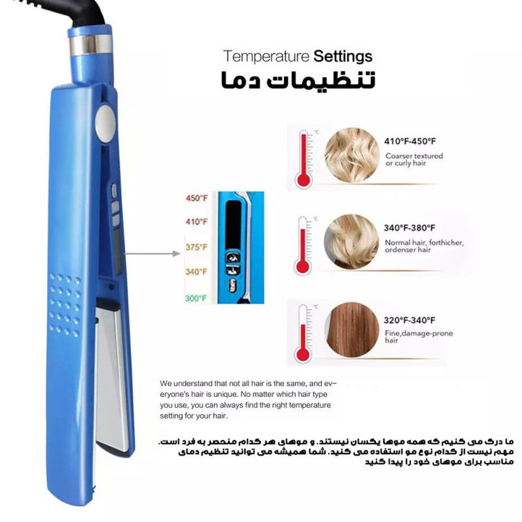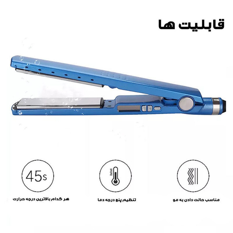 صاف کردن موها زمانيکه خشک هستند يا زمانيکه تازه شسته شدهاند و هنوز مرطوب هستند مورد نياز بسياري افراد است؛ بهخصوص زمانيکه ميخواهند به مهماني بروند وعجله دارند. این اتو مو و فر کننده ی مو اين امکان را فراهم ميکند. اين محصول را ميتوان در 5 درجه حرارت مختلف تا 450 درجهي سانتيگراد تنظيم کرد. همين گستره دماي زياد است که صاف کردن موها را در 2 حالت خشک و مرطوب امکانپذير ميکند. اين کالا با بيشينه دماي 450درجه سانتيگراد موجب صاف کردن سريع موها ميشود. اين اتو مو داراي سيستم خاموش شدن خودکار است. ويژگياي که نهتنها طول عمر آن را افزايش ميدهد بلکه به ايمني استفاده کردن از دستگاه ميافزايد. جنس صفحات اتو مو معمولا از نانوتیتانیوم است.