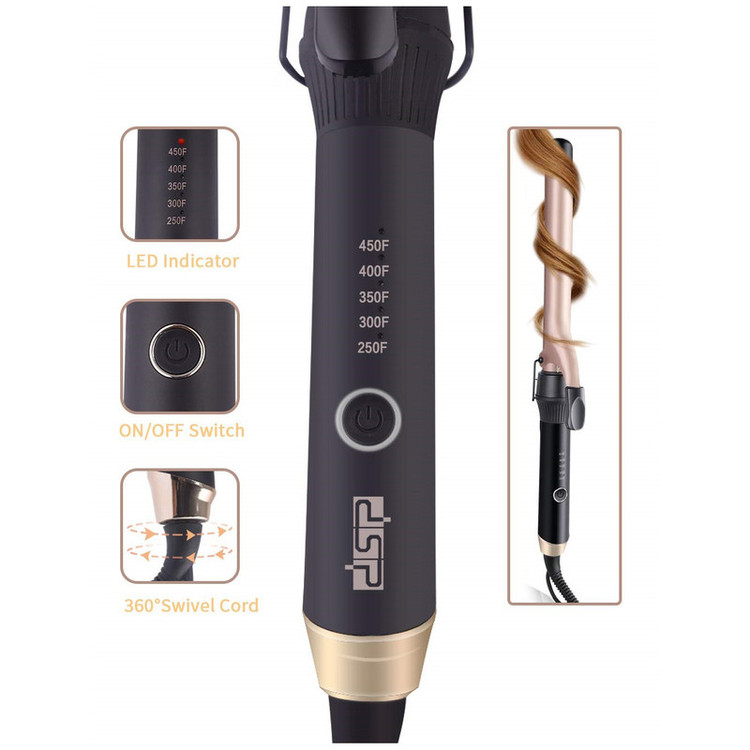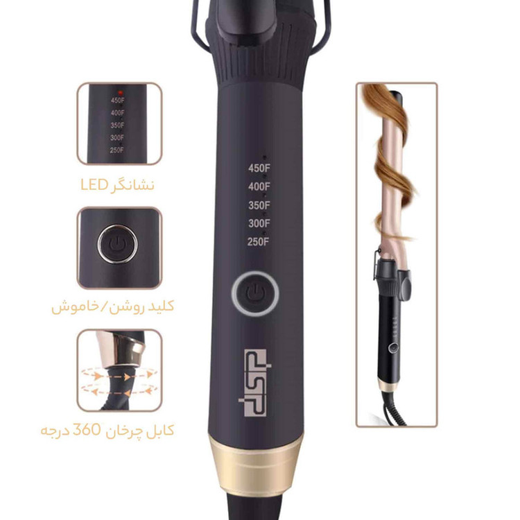 فرکننده ها از نظر صفحات به دو دسته تقسیم می شوند، فلزی و سرامیکی. نوع سرامیکی استانداردتر از مدل فلزی می باشد و هیچ نوع آسیبی به موها وارد نمی کند. فرکننده مو سرامیکی دی اس پی مدل 20105 دارای روکش سرامیکی تورمالین می باشد. سرامیکی تورمالین با پوششی نرم به شکلی عالی دما را انتقال می دهد و موجب نرمی، لطافت و درخشندگی موها می گردد .فر مو ۹ میلی متری دی اس پی دارای قابلیت تنظیم ۵ دمای مختلف است و درجه فارنهایت می باشد، که بسته به نوع مو می توان دمای مورد نظر را انتخاب نمود. طیف دمایی ۲۵۰F تا ۳۰۰F مناسب موهای ظریف، دکلره شده و آسیب دیده می باشد. جهت حالت دادن موهای طبیعی، رنگ شده و موج دار می توان از طیف دمایی ۳۵۰F تا ۴۰۰F استفاده نمود. طیف دمایی ۴۵۰F برای حالت دادن موهای ضخیم می باشد. پس از انتخاب دما چراغ نشان گر قرمز رنگ شروع به چشمک زدن می کند تا دمای میله به دمای تنظیم شده برسد. در این حالت چراغ نشان گر به صورت ثابت روشن می ماند. سیم دستگاه فر مو ۹ میلی متری DSP 20105 در محل اتصال به بدنه دارای قابلیت چرخش کامل می باشد که علاوه بر آن که امکان کار کردن آسان را فراهم می کند از پیچ خوردن و فرسودگی سیم نیز جلوگیری می نماید.