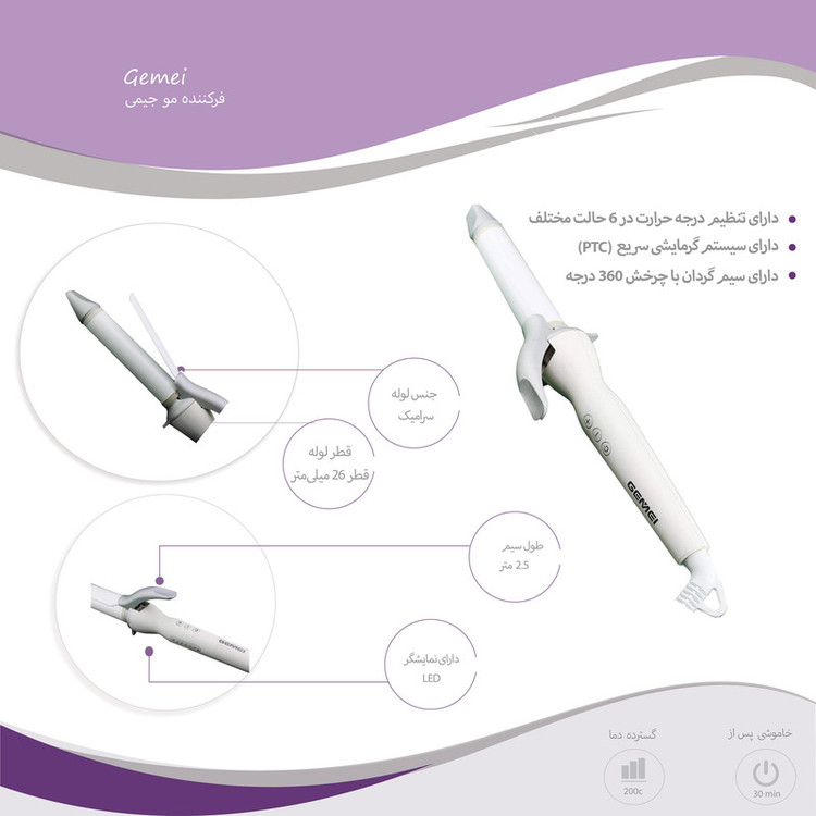 مو فرفریها از گذشته تا به امروز مورد توجه همه ی افراد جامعه هستند. اگر توجه کرده باشید موهای فر جایگاه ویژهای در دنیای مد و زیبایی دارد. به همین خاطر دستگاههای مختلفی برای فر کردن موها ساخته شدهاند که در این راستا شرکت جیمی دستگاه فرکننده حرفهای GM 409 برای مشتریانش روانه بازار کرده است که مورد تایید استاندارد اروپا CE قرار گرفته است. این دستگاه علاوهبر مصرف شخصی برای استفاده سالنی یعنی آرایشگاهها گزینه بسیار مناسبی است این فرکننده دارای لوله سرامیکی به قطر 26 میلیمتر است و حرارت بهصورت کاملاً مساوی در تمام سطوح کفی فرکننده تقسیم میشود و همچنین هنگام گرم شدن یک نوع حرارت از نوع اینفرارد (مادون سرخ) ایجاد میکند که این حرارت میتواند از ضخامتهای کم ساقه مو عبور کند و به رطوبت طبیعی مو آسیبی نمیزند. از طرفی دارای تنظیم درجه حرارت در 6 حالت مختلف ( 100 ، 140،120، 160، 180 و 200 درجه سانتیگراد) است که با توجه به نوع موهایتان قادر خواهید بود روی درجه متناسب تنظیم کنید و به دلیل آنکه دارای سیستم گرمایشی سریع (PTC) است به سرعت به دمای انتخابی یا حداکثر دما خواهد رسید. همچنین این محصول مجهز به سیستم خاموشی خودکار است، و هنگامی که اتو مو در مدت زمان طولانی(30 دقیقه) ثابت بماند بطور اتوماتیک خاموش میشودکه این عملکرد باعث افزایش طول عمر دستگاه میشود. از طرفی این محصول دارای سیمگردان با چرخش 360 درجه است که این قابلیت ضمن راحت کردن کار با دستگاه از گره خوردن و فرسودهشدن سیم جلوگیری میکند.
