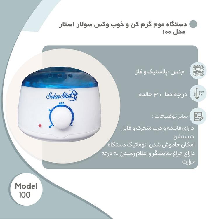 خیلی اوقات برای امورات اصلاح نه وقت کافی داریم و نه با بالا بودن هزینه های آن میتوانیم کنار بیایم. بنابراین کافیست یک دستگاه ذوب کننده انواع موم و وکس های مخصوص اپیلاسیون را در دسترس داشته باشیم. موم گرم کن سولار استار یکی از بهترین ابزارهای ذوب کردن می باشد. این دستگاه که نمونه ی اصلی و برخلاف سایر نمونه های کپی شده می باشد بسیار کارآمد و بادوام می باشد. دستگاه موم گرم کن اپیلاسیون سولار استار دارای قابلمه و درب متحرک و قابل شستشو و امکان خاموش شدن اتوماتیک دستگاه پس از رسیدن به درجه حرارت موردنظر و دارای چراغ نمایشگر جهت نمایش و اعلام رسیدن به درجه حرارت را دارا است که دیگر نگران زیاد داغ شدن شمع اصلاح نیستید.