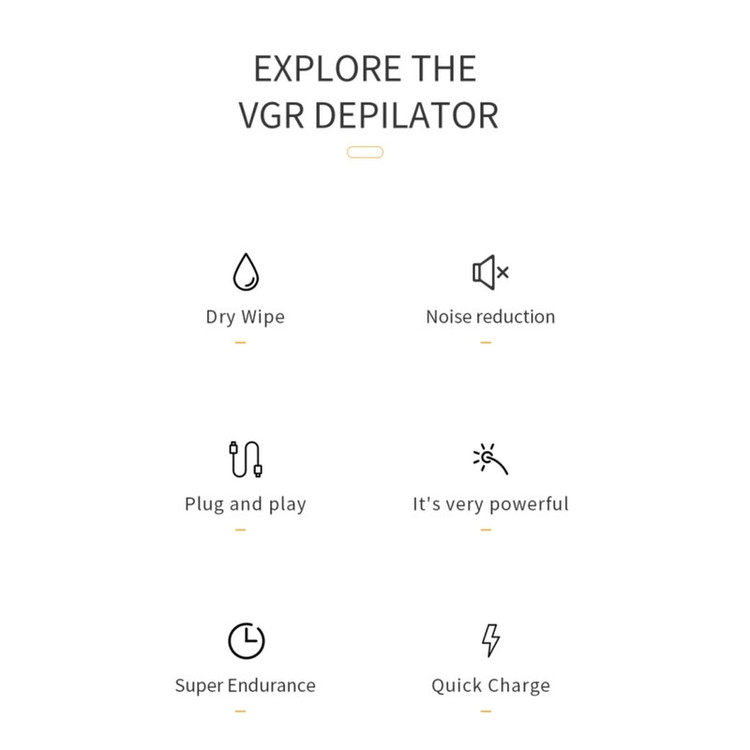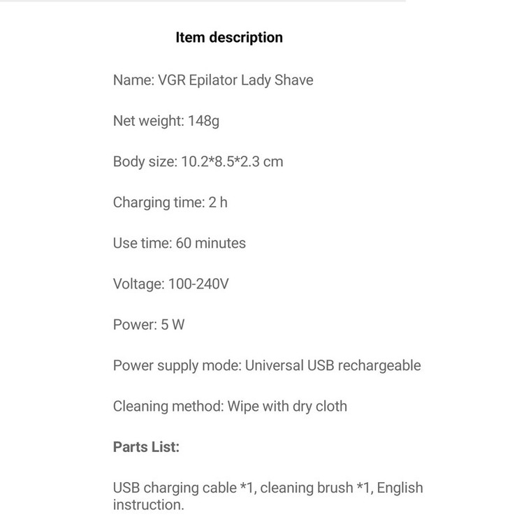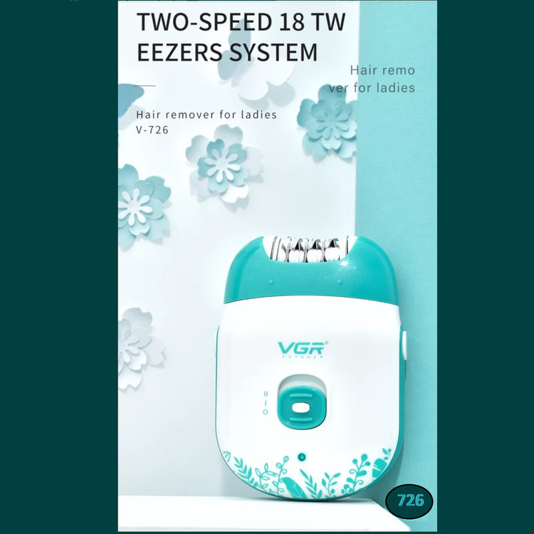 داشتن یک اپیلاتور که بتواند موهای بدن را با سرعت زیاد از ریشه جدا کند میتواند مورد علاقه بسیاری از خانمها قرار گیرد. دستگاه اپیلاتورV-726 که توسط شرکت وی جی ار تولید شده است میتواند با یک بار قرار گرفتن آن روی پوست تعداد زیادی از موها را از ریشه جدا کند. برای این اپیلاتور تنها باتری قابل شارژ به عنوان منبع تغذیه در نظر گرفته شده است. علاوهبر سری اپیلاتور، سری کوچک برای جدا کردن موهای مربوط به مناطق محدود وجود دارد که نیاز فرد را از خرید دستگاهی جداگانه برای اصلاح این مناطق بر طرف کرده است. از آنجاییکه این مدل قابلیت شارژ شدن را دارد میتوان از آن پس از 8ساعت شارژ کامل به مدت60 دقیقه استفاده کرد. با استفاده از برس تمیز کننده که برای این اپیلاتور به عنوان اقلام همراه در نظر گرفته شده میتوان دستگاه را پس از اصلاح بهراحتی تمیز کرد.