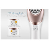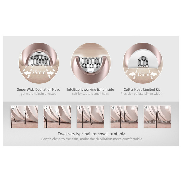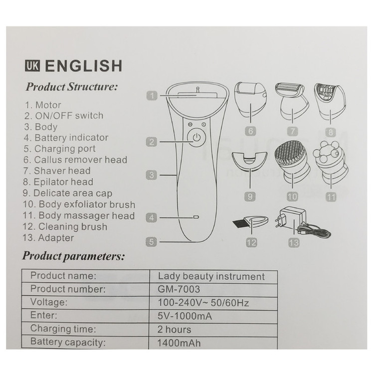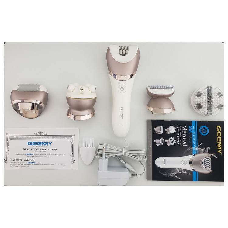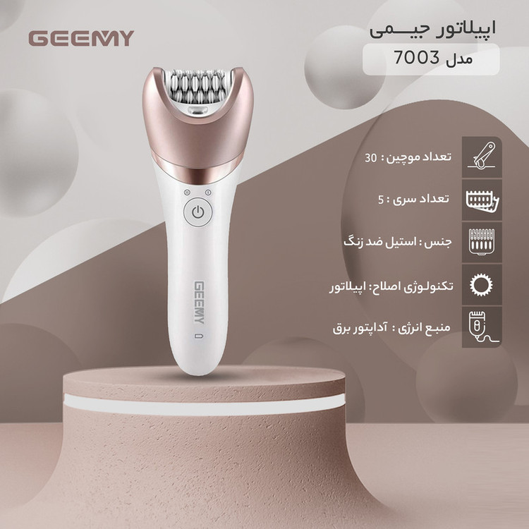 اپیلاتور جیمی مدل 7003 محصولی کاملا حرفه ای و ضد آب است که همزمان 5 نیاز مختلف را برآورده می کند. ماساژور بدن ، سری برس پاکسازی پوست و سری سوهان پا (یا همان سنگ پا) است. سری اپیلاتور، موچینهایی از جنس استیل ضد زنگ دارد که طراحی ویژه آنها، کمک میکند که همهی موها حتی موهای خوابیده از سطح پوست بلند شده و در دام موچینها بیافتند. روی سری اپیلاتور یک پوشش دیگر میتوان قرارداد تا نقاط محدود را به راحتی اصلاح کرد. سری شیور که برای کوتاه کردن موها از ته استفاده میشود. برای اصلاح نقاط حساس توسط شیور میتوان از شانهی مخصوصش استفاده کرد. پس از اتمام کار اصلاح میتوان به کمک سری ماساژور چرخشی، روی پوست را ماساژ داده تا ضمن برخورداری از حسیلذتبخش، تفاوت رنگ قسمتهای مختلف پوست نیز برطرف شود. از سری سنگ پا می توان برای پاکسازی پوست مرده کف پا استفاده کرد. در سری اپیلاتور سرعت حرکت موچینهای اپیلاتور را میتوان روی یکی از دو حالت معمولی و تند قرار داد. این اپیلاتور ضد آب است . پایین سری اپیلاتو یک چراغ LED قرار داده شده که بهخوبی موضع را روشن کرده و میتوان حتی موهای ریز و روشن را دید و اصلاح کرد. منبع انرژی اپیلاتور از باتری قابل شارژ لیتیوم یونی آن تأمین میشود که با 2 ساعت شارژ کردن آن میتوان به مدت 90 دقیقه از دستگاه استفاده کرد. از این دستگاه هم با سیم و هم بدون سیم میتوان استفاده کرد.