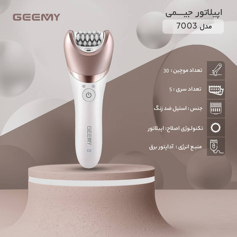 اپیلاتور جیمی مدل 7003 محصولی کاملا حرفه ای و ضد آب است که همزمان 5 نیاز مختلف را برآورده می کند. ماساژور بدن ، سری برس پاکسازی پوست و سری سوهان پا (یا همان سنگ پا) است. سری اپیلاتور، موچینهایی از جنس استیل ضد زنگ دارد که طراحی ویژه آنها، کمک میکند که همهی موها حتی موهای خوابیده از سطح پوست بلند شده و در دام موچینها بیافتند. روی سری اپیلاتور یک پوشش دیگر میتوان قرارداد تا نقاط محدود را به راحتی اصلاح کرد. سری شیور که برای کوتاه کردن موها از ته استفاده میشود. برای اصلاح نقاط حساس توسط شیور میتوان از شانهی مخصوصش استفاده کرد. پس از اتمام کار اصلاح میتوان به کمک سری ماساژور چرخشی، روی پوست را ماساژ داده تا ضمن برخورداری از حسیلذتبخش، تفاوت رنگ قسمتهای مختلف پوست نیز برطرف شود. از سری سنگ پا می توان برای پاکسازی پوست مرده کف پا استفاده کرد. در سری اپیلاتور سرعت حرکت موچینهای اپیلاتور را میتوان روی یکی از دو حالت معمولی و تند قرار داد. این اپیلاتور ضد آب است . پایین سری اپیلاتو یک چراغ LED قرار داده شده که بهخوبی موضع را روشن کرده و میتوان حتی موهای ریز و روشن را دید و اصلاح کرد. منبع انرژی اپیلاتور از باتری قابل شارژ لیتیوم یونی آن تأمین میشود که با 2 ساعت شارژ کردن آن میتوان به مدت 90 دقیقه از دستگاه استفاده کرد. از این دستگاه هم با سیم و هم بدون سیم میتوان استفاده کرد.