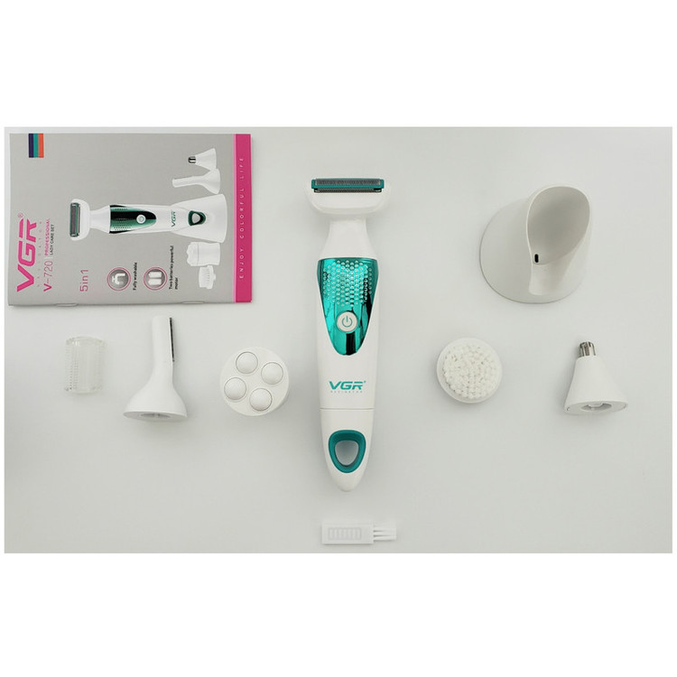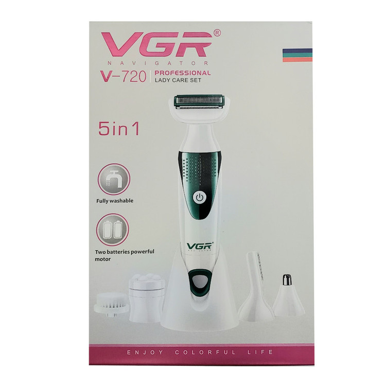 وی جی ار مدل 720 ست ماشین اصلاح صورت و بدن میباشد که کاملا ضدآب و با 2 باطری نیم قلمی قابل استفاده میباشد سری های این دستگاه عبارتند از سری اصلاح مو بینی، سری ماساژور، سری اصلاح موی ابرو همراه با شانه برای بلند یا کوتاه اصلاح کردن،سری شیور بدن و صورت و سری پاکسازی صورت است.