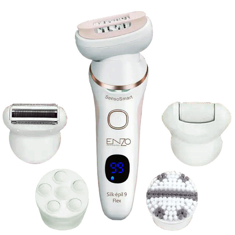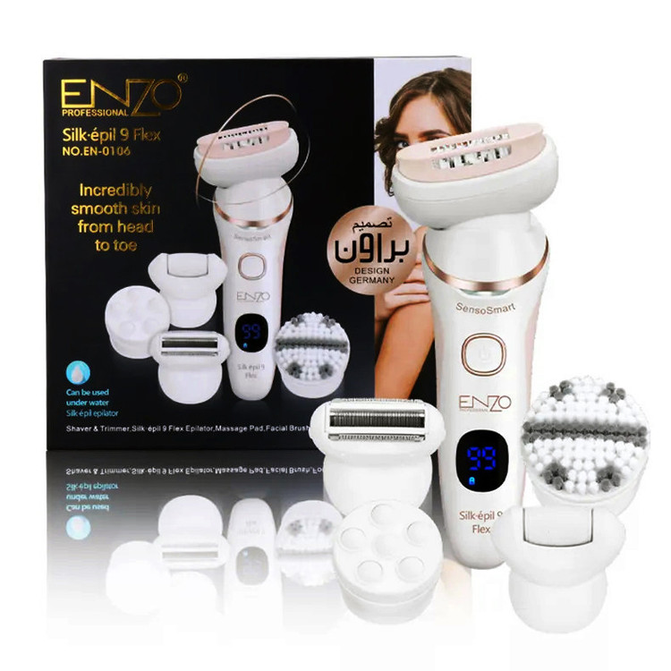 دستگاه قابل شارژ و 5 کاره انزوپروفیشینال EN-0106 با کاربری حرفه ای و نیمه حرفه ای که توسط متخصصین آلمانی طراحی شده است، دارای 5 سری اپیلاتور، شیور، سنگ پا، ماساژور و پاکسازی پوست (فیس براش) می باشد. سری های متعدد، طراحی زیبا و مدرن، کوچک و قابل حمل بودن این دستگاه از مزیت های آن به شمار می آید. قابل شستشو و ضدآب بودن این دستگاه کارایی آن را چندین برابر کرده بطوریکه زیر آب نیز قابل استفاده است. نمایشگر ال ای دی روی دستگاه میزان شارژ آن را نشان می دهد.