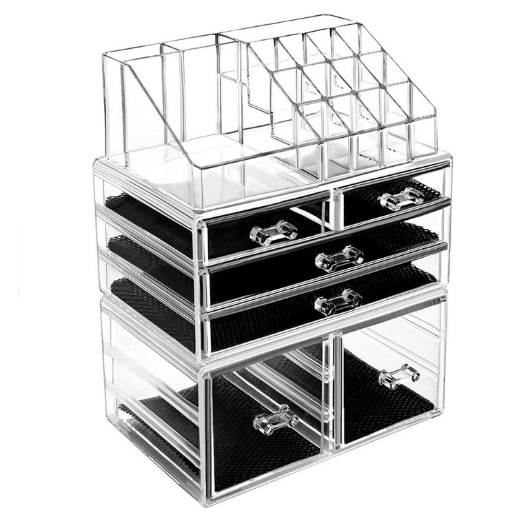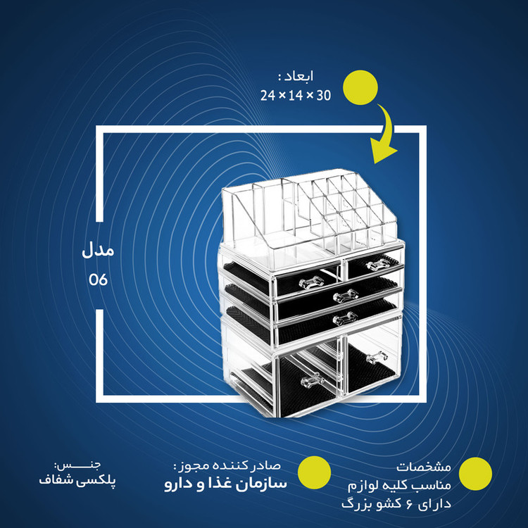 لوازم ریز و درشت آرایشی و بهداشتی نیاز به طبقه بندی و رعایت اصول مرتب شدن دارند، شکل و فرم آنها در چیدمان باید با نظم خاصی اجرا شود تا از به هم ریختگی فضای اتاق خواب کم شود. اگر لوازم آرایشی شما دارای طبقات مشخص باشند کیفیت خود را بهزودی از دست نمی دهد. استندهای آرایشی توسط تولیدکنندگان مختلف تولید میشود که از کوچکترین ابزار آرایش تا بزرگترین وسیله که برس مو است را میتوان داخل این استند قرار داد. استند آرایشی مدل 06 برای هر ابزاری جایگاه منحصر بهفردی دارد. این محصول از پلاستیک ساخته شده و کاملا شفاف است و در صورتی دیده شدن کثیفی و یا آلودگی قابل شستشو خواهد بود. این نوع استند جیگاه ویژهای برای رژلب، مدادهای آرایشی، تجهیزات آرایشی صورت و چشم را در خود جای داده است. این محصول برای هر نوع وسیلهی آرایشی طبقهبندی شده و امکان قرار گرفتن دوازده عدد رژلب در این استند وجود دارد، همچنین6 کشو لارج ,دارای 2 کشو بزرگ و 4 کشو کوچک تر می باشد که کشوهای پایینی که بزرگ هستند بسیاری از لوازم آرایشی مانند لاک,کرم پودر,پنکیک,کرم,دستمال مرطوب و... را به راحتی در خود جا می دهد.. این محصول در ابعاد 24 × 14 × 30 سانتی متر است که در روی میز آرایشی و هر کمدی جای داده میشود. استند آرایشی مدل 06 تمام ابزارهای آرایشیتان را منظم کرده و استفاده و دسترسی را برایتان راحت کرده است.