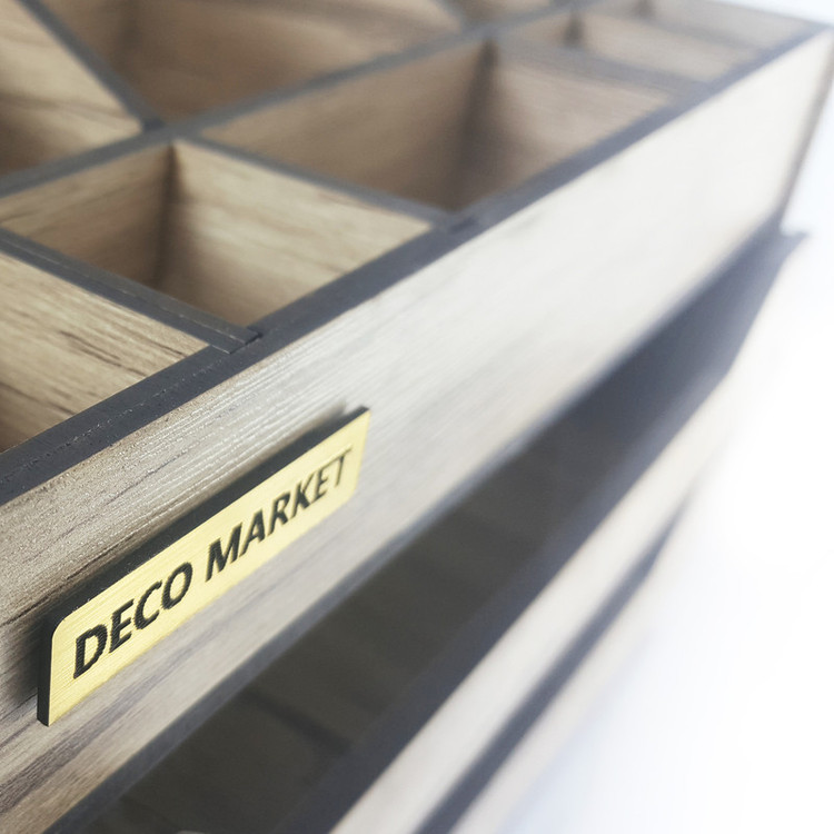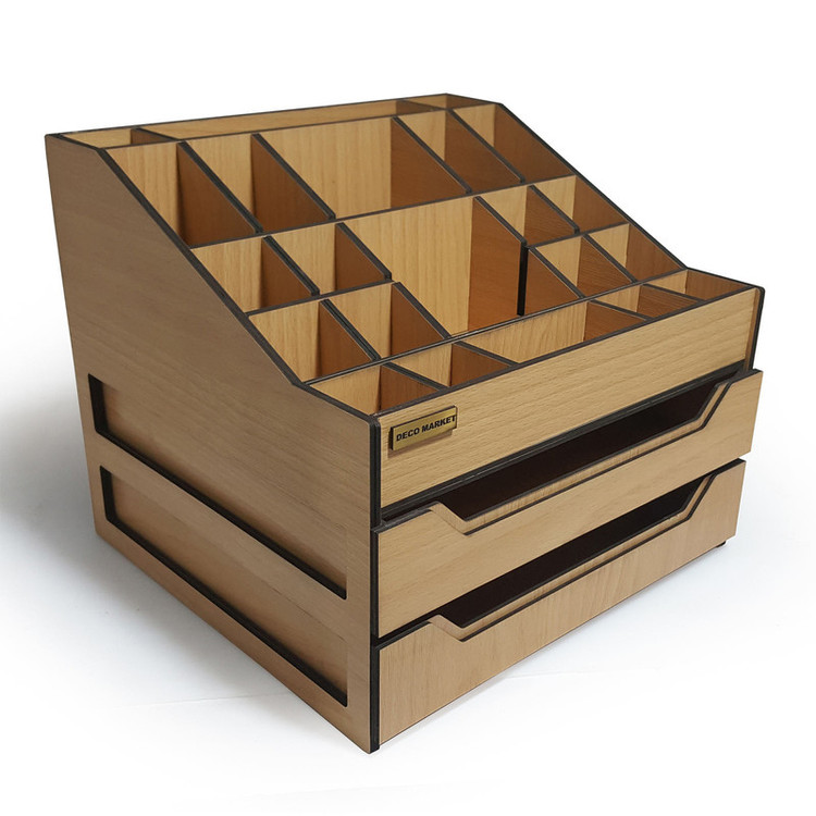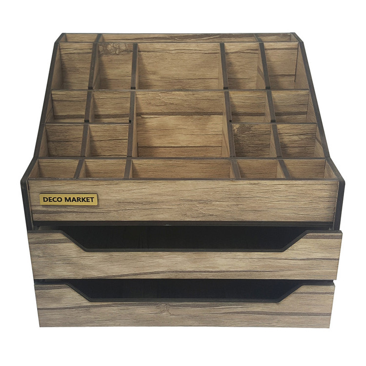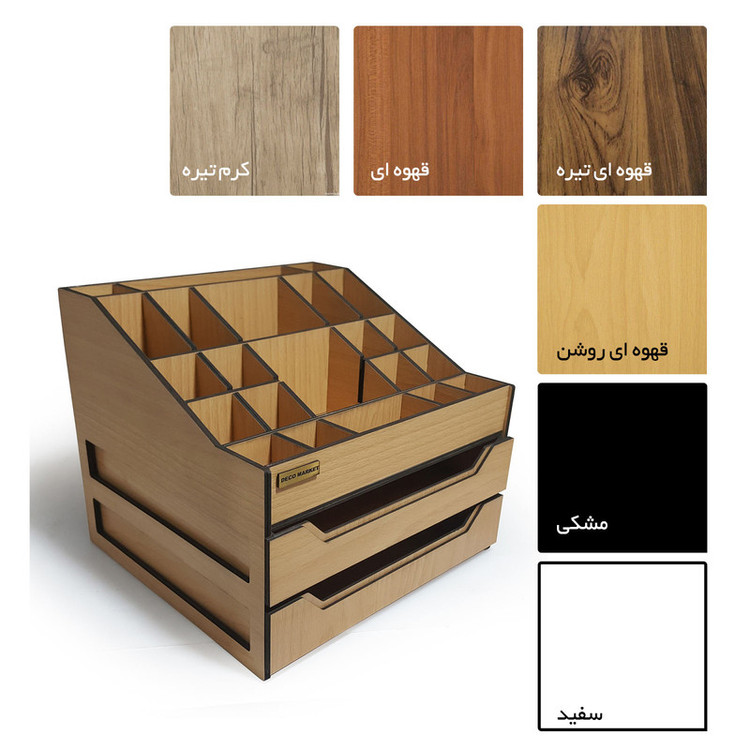 استند لوازم آرایشی دکو مارکت مدل نانسی ساخته شده از چوب ام دی اف بصورت 2 لایه با ضخامت 6 میلی متر برای استحکام بیشتر محصول طراحی شده است.این محصول با داشتن دو کشو بسیار محکم در بدنه و همچنین تقسیم بندی شبکه ایی در قسمت بالایی برای قرار دادن وسایل کوچک قدم مانند انواع رژ ،عطر و ... قدم مهمی در راستای نظم دادن به میز و وسایل روی آن است.
