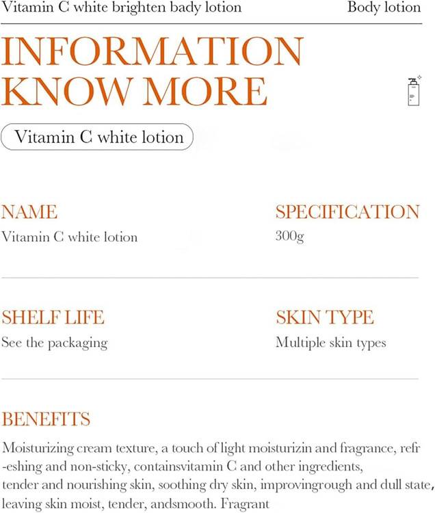 مرطوبکننده قوی – پوست را نرم و لطیف کرده و از خشکی جلوگیری میکند. ✅ حاوی ویتامین C – تغذیهکننده و روشنکننده پوست برای ظاهری درخشان و یکدست. ✅ بافت سبک و جذب سریع – بدون حس چسبندگی، مناسب برای استفاده روزانه. .