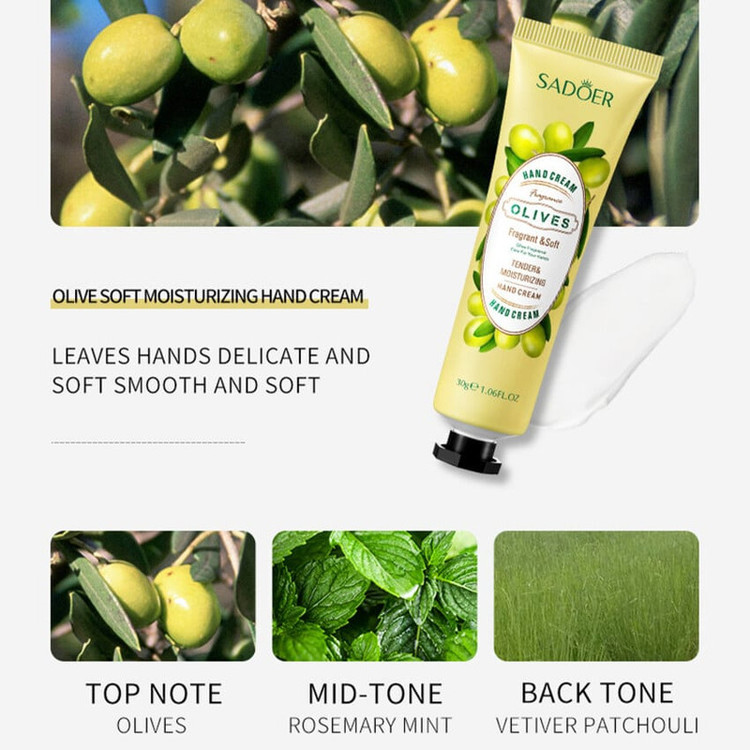 کرم دست سادور SADOER با رایحه و عصاره زیتون , این کرم ها آبرسان و نرم کننده پوست دست هستند و با بافت سبکی که دارند پوست دست را بصورت عمقی مرطوب کرده و باعث بهبود خشکی آن می شوند. کرم سادور با سایز مناسبی که دارند به راحتی در کیف جا میشوند و حتی بیرون از خانه هم میتوانید از دستان خود به مراقبت کنید.