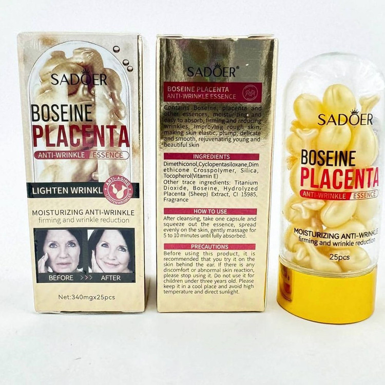 کرم صورت کپسولی جوانساز بوسین و پلاسنتا سادور 25 عددی با وزن 340 میلی گرم و کلاژن ساز قوی و از بین برنده چین و چروک، جوان ساز و ضد پیری پوست و لیفت کننده و باز کننده چروک پوست می باشد.