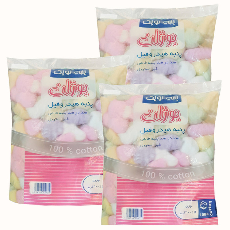 با خرید این کالا سه بسته پنبه 100 گرمی بوژان تحویل میگیرید. پنبه آرایشی توپک 100 گرمی بوژان بسیار نرم و لطیف بوده و فاقد هرگونه آلایندگی خارجی می باشد. دارای کیفیت بالا و دارای مهر استاندارد بشماره 8930761912 و همچنین مجوز بهداشت و سیب سلامت بشماره 35/11075 می باشد. پنبههای آرایشی توپک بوژان جهت پاک کردن مواد آرایشی و ضد عفونی کردن استفاده می شود و شما قادر خواهید بود با استفاده از پاککنندههای آرایشی یا محلول های ضد عفونی کننده این کار را انجام دهید. البته این نکته را فراموش نکنید که از این پنبه به صورت مستقیم روی زخم باز استفاده نکنید و حتما از محلول های ضد عفونی کننده قبل از تماس با زخم استفاده شود. پنبه جزو لوازمی محسوب میشود که عموما برای مصارف مختلفی در مکانهای متفاوت مورد استفاده قرار میگیرد و به نوعی میتوان گفت پنبه از ملزوماتی است که در هر محیطی اعم از محیط کار، منزل و… وجود آن ضروری و مورد نیاز است.