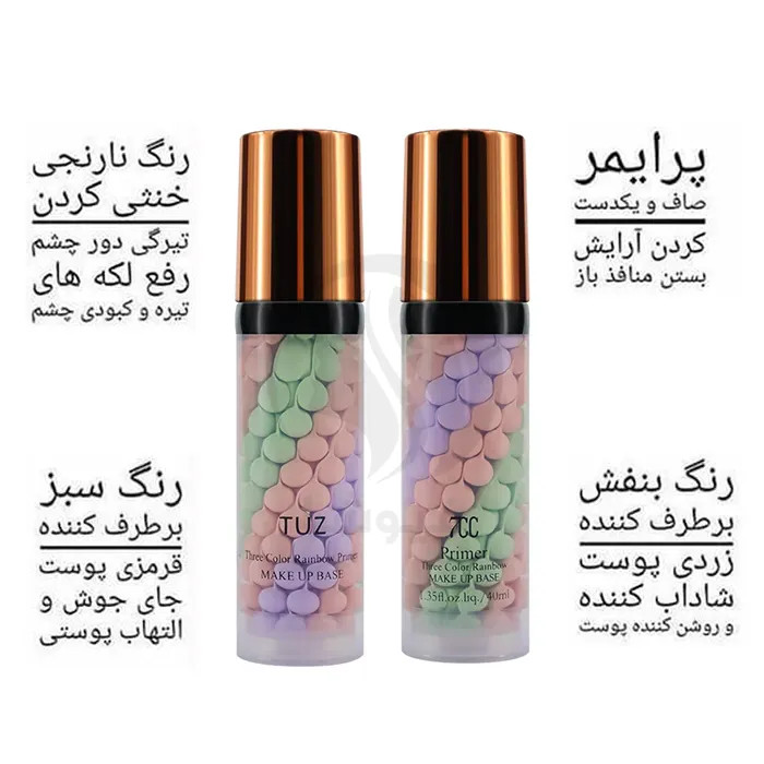 پرایمر رنگی tuz با داشتن هر ۳ رنگ، یک محصول تمام و کمال است. پرایمر آرایش را بی نقص می سازد و پوست را مخملی میکند.