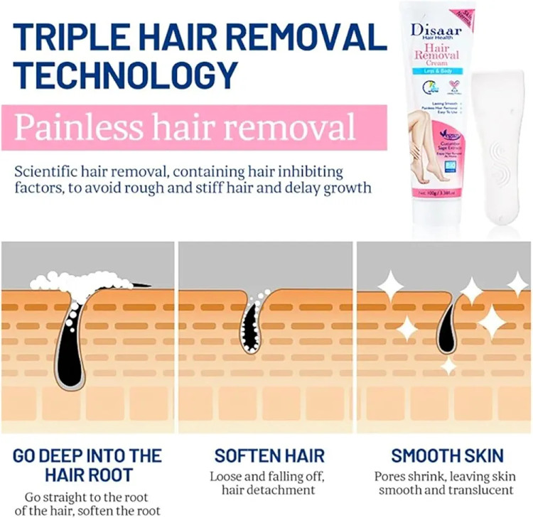 عملکرد سریع: از بین بردن موهای زائد تنها در ۵ دقیقه بدون درد: حذف موها بدون ایجاد احساس سوزش یا ناراحتی نرمکننده و مرطوبکننده: حاوی عصاره خیار و مریمگلی برای لطافت پوست
