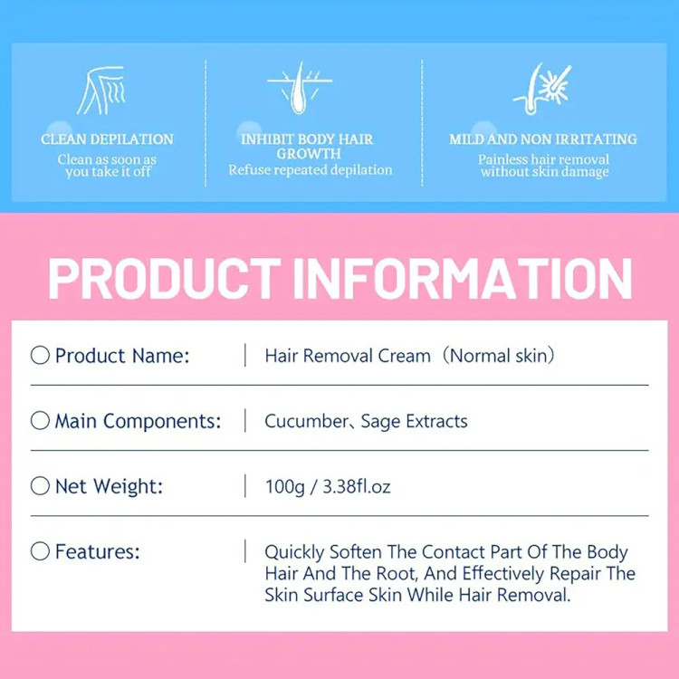 حذف مو در 5 دقیقه (اثر سریع) بدون باقیماندن اثری از مو مناسب برای پوستهای خشک ایجاد احساس لطافت و نرمی روی پوست دارای ترکیبات مرطوبکننده و تسکیندهنده پوست وگان و بدون تست حیوانی حاوی روغن آرگان و کره شی فرمولاسیون ایمن و دارای تأییدیه BIO