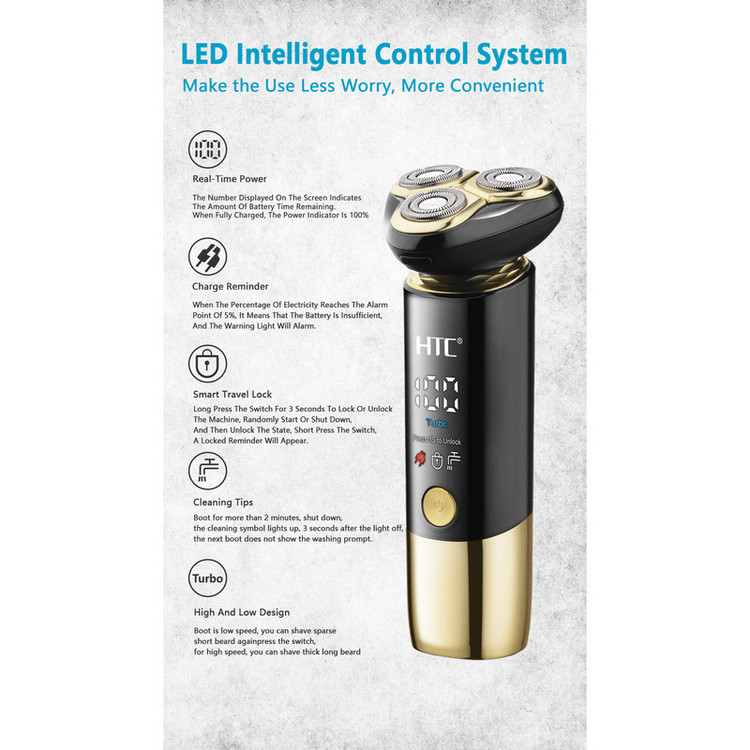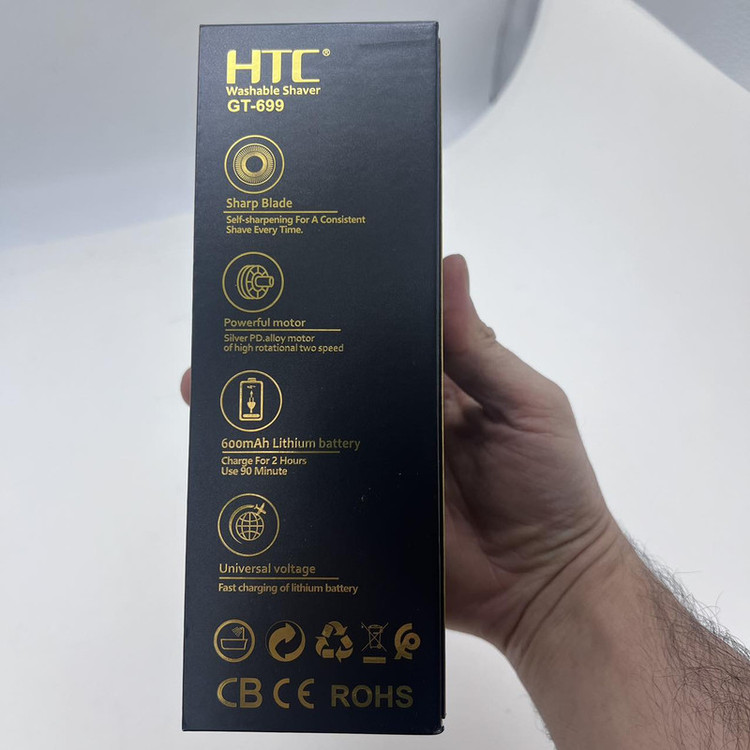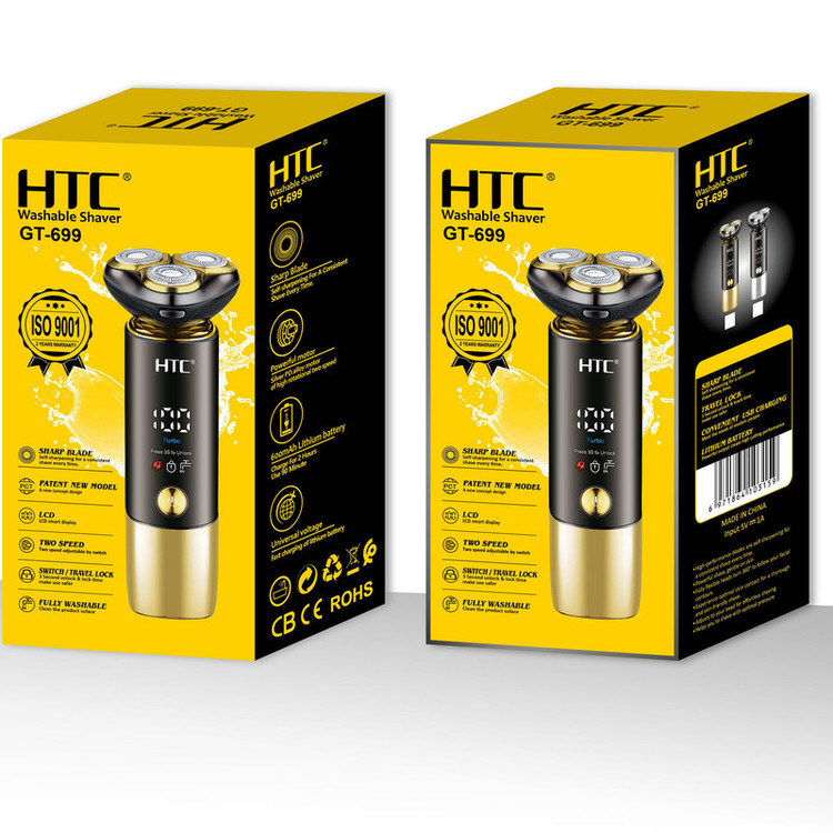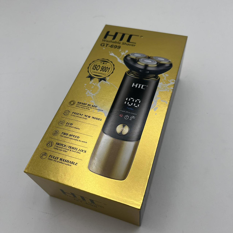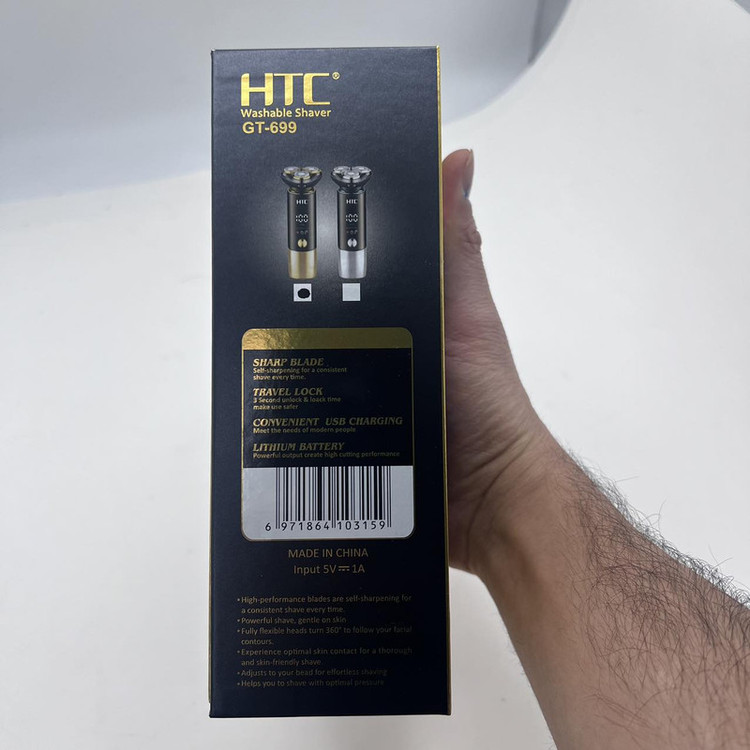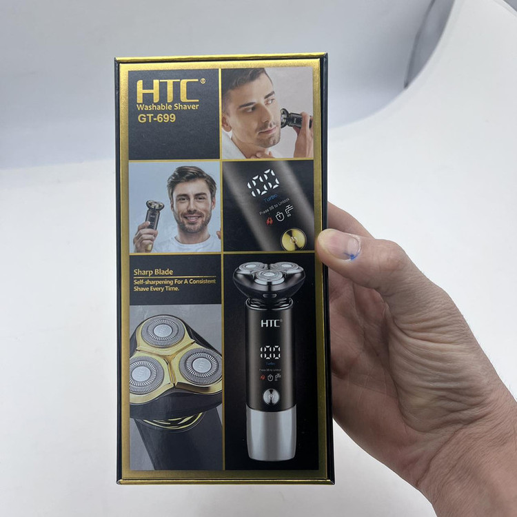 ماشین اصلاح صورت و بدن اچ تی سی مدل GT-699 از جدیدترین محصولات شرکت اچ تی سی است. یکی از ویژگی های این ماشین ضدآب و قابل شستشو بودن آن است همچنین دارای صفحه نمایشگر می باشد که میزان شارژ آن را نشان می دهد و طراحی بسیار شیک و زیبا دارد دیگر ویژگی برتر این ماشین این است که به وسیله هاب USB (پاور بانک، برق خودرو و لپ تاپ) شارژ می شود. این ماشین داری حالت توربو می باشد. سری مخصوص اصلاح سر و صورت موها را در 0 میلی متری کوتاه می کندو کاملا همانند تیغ است و از فناوری چهار بعدی بهره می برد. تیغه های تیز و برنده، ریزترین و ضخیم ترین موها را به آسانی اصلاح می کند. جنس تیغههای این محصول از استیل ضد زنگ بوده، که در برابر هوا و رطوبت از ماندگاری بالایی برخوردار است. و همچنین از تکنولوژی جدید اچ تی سی در این محصول استفاده شده است حالت توربو این محصول در صورت نیاز با یک بار زدن دکمه پاور فعال میشود و همچنین این دستگاه دارای قفل سفری هست برای قرار دادن دستگاه در چمدان تا به صورت ناخواسته دستگاه در کیف شما روشن نشود