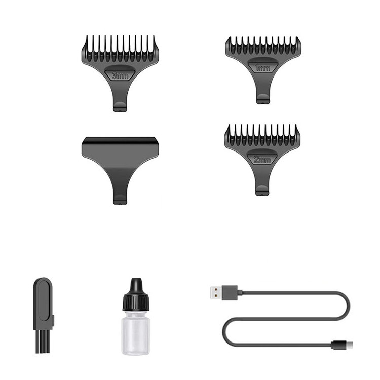 کابل شارژ - برس تمیزکننده - روغن روانکاری - محافظ تیغه - 3 عدد شانه تنظیم ارتفاع برش در سایزهای 1،2،3 میلی متر