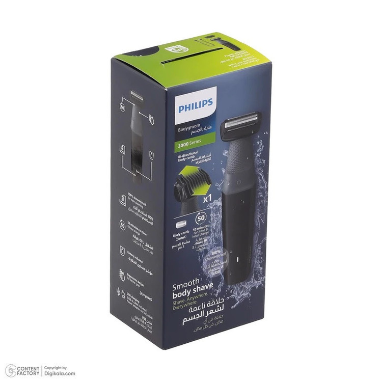قابل استفاده زیر دوش حمام - ۱۰۰٪ ضد اب - تیغه های نرم ضد حساسیت - دارای یک عدد شانه - ارگونومی - ۵۰ دقیقه استفاده بعد از شارژ کامل - نمایشگر باطری برای ۵ دقیقه اخر شارژ -سری جدید
